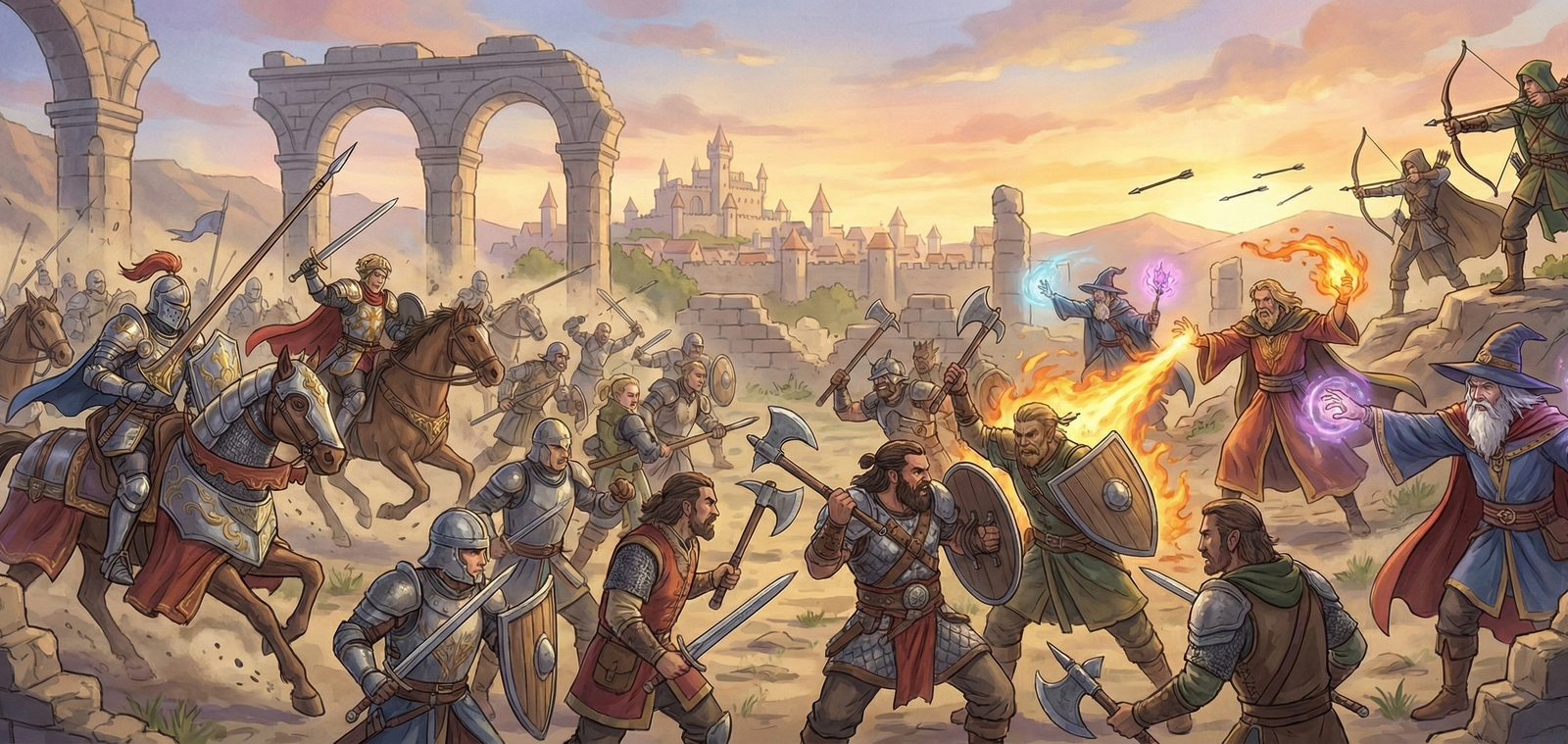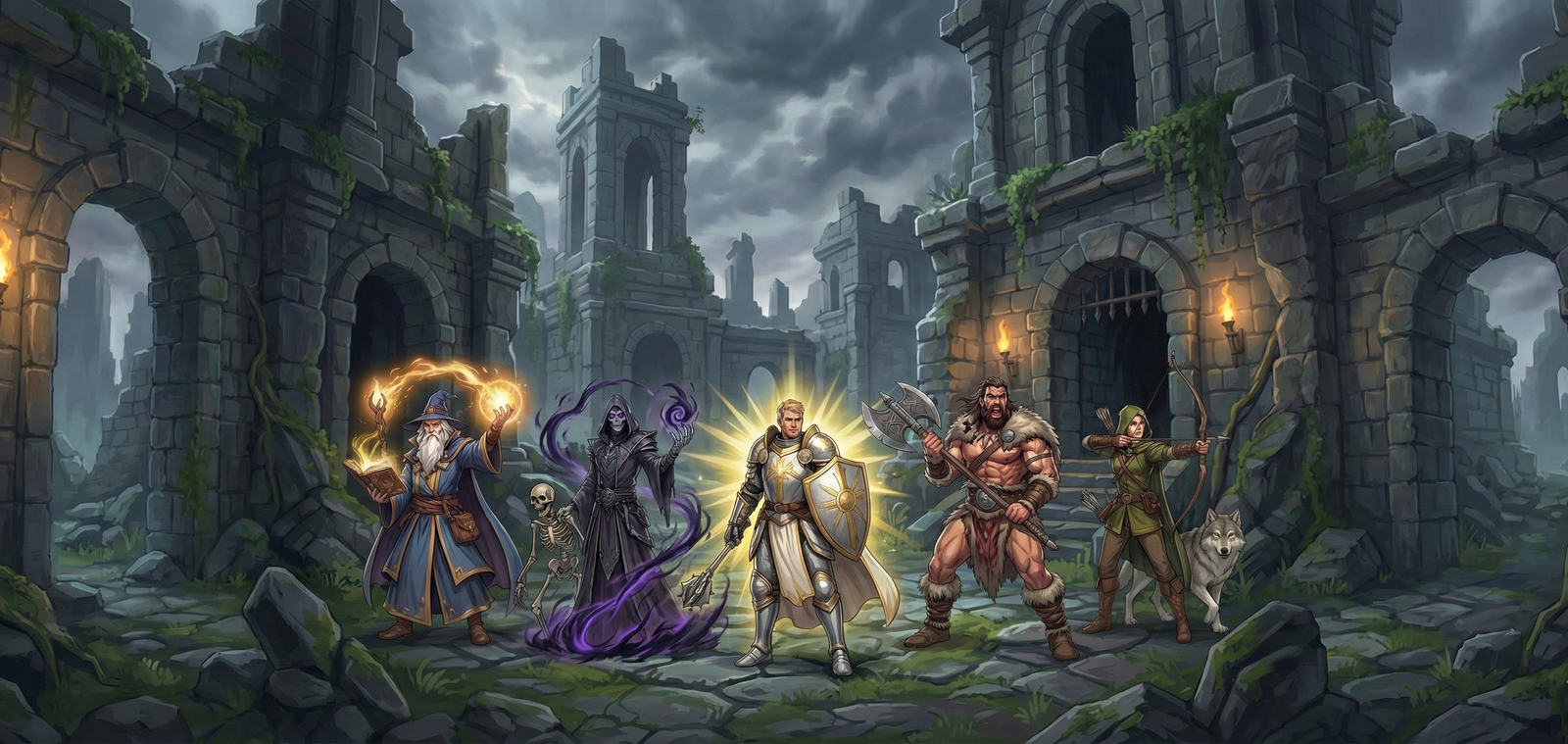 Bárbaro, Necromancer, Paladino, Ranger e Wizard. Habilidades únicas que definem seu papel estratégico no PvM. Sistema de Aggro. Monstros inteligentes que focam no Tanker ou no maior DPS.