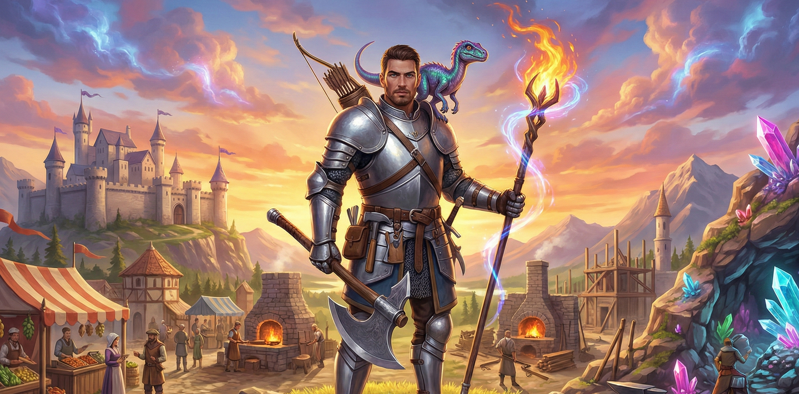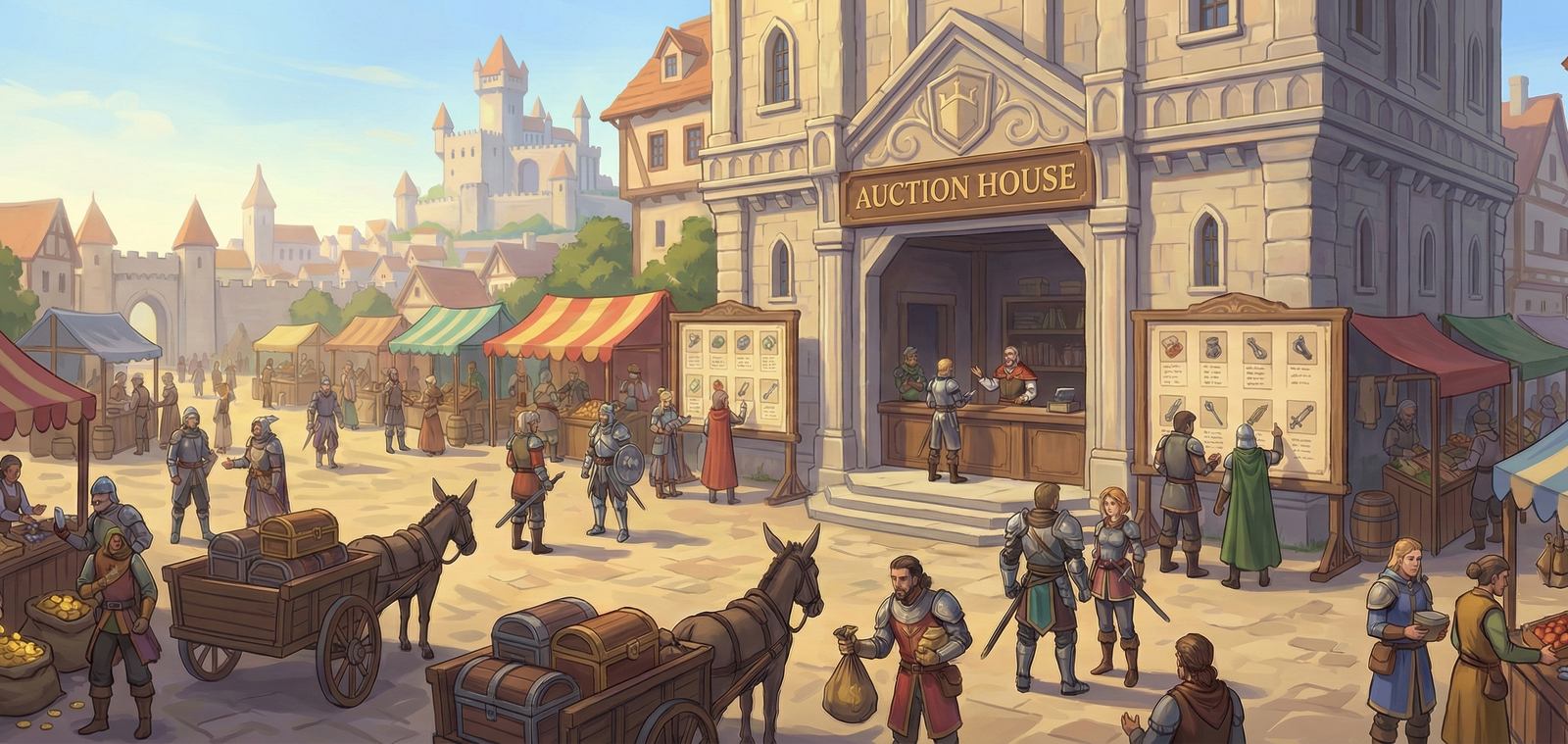 Sistema de leilão moderno para facilitar o comércio entre jogadores. Um mercado dinâmico e seguro para negociar raridades, itens mágicos e equipamentos sem a necessidade de intermediários.