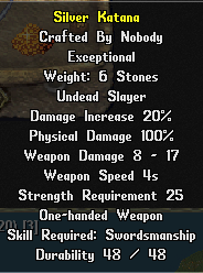 A quantidade de propriedades mágicas é enorme e estão sujeitas à alterações na versão final, portanto, por enquanto se baseiem em conteúdos localizados em sites como Stratics ou Uoguide até definição final.