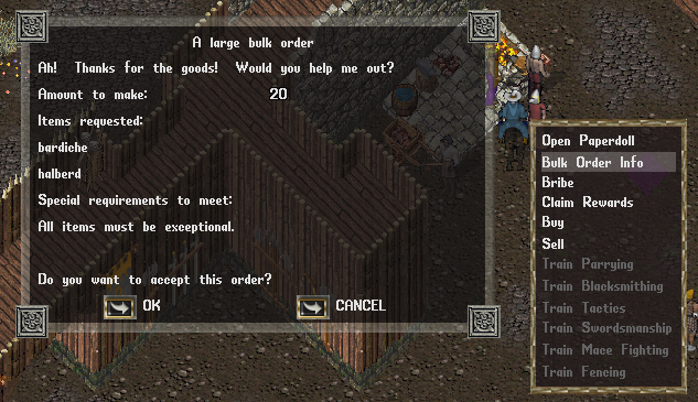 Também entra em vigor o sistema de Bulk Orders (BODs). Após atingir um alto nível na skill de craft, você poderá solicitar aos NPC’s daquele ofício uma Bulk Order. Basta clicar no NPC e acionar o menu Bulk Order Info: