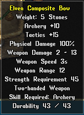 Da mesma forma, um arco qualquer poderá se transformar em um Elven Bow, Elven Crossbow, Elven Heavy Crossbow, porém no sistema de bowcraft, não é possível craftar diretamente uma arma com essa propriedade, será preciso primeiro craftar as armas usando as madeiras (inclusive as madeiras novas introduzidas: