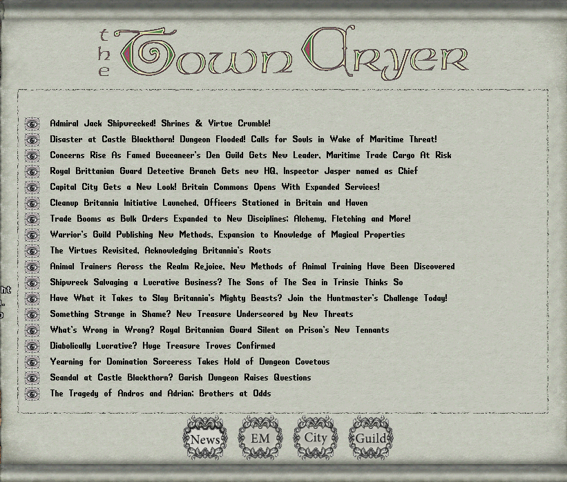 Os Town Criers passarão a ser os jornaleiros do game. Assim que logar no servidor, você será agraciado com as últimas novidades (e estas poderão ser consultadas clicando 2 vezes neste NPC, que geralmente se situada em frente à maioria dos bancos de Britannia).